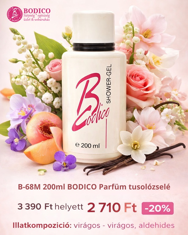 BODICO Parfüm tusolózselék: 200 ml 3 - 5% parfümolaj-koncentráció. Olaj/víz emulzió Minden bőrtípushoz, de különösen javasolt száraz és érzékeny bőr esetén.